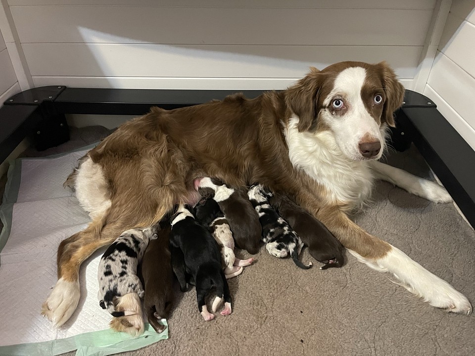 This is a repeat cross. AKC and ASCA. Health tested parents. We should have lots of blue eyes too! 8 puppies arrived October 25! 5 boys and 3 girls. Email me for more information!