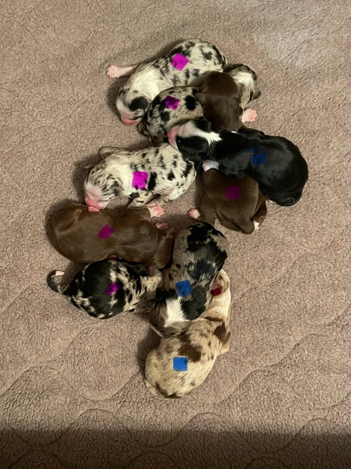 This is an AKC litter! They gave us all colors from this repeat cross. Pebbles even shared her Merle gene this time! Genetically clear! Their first litter was amazing. We expect the same out of this colorful litter!